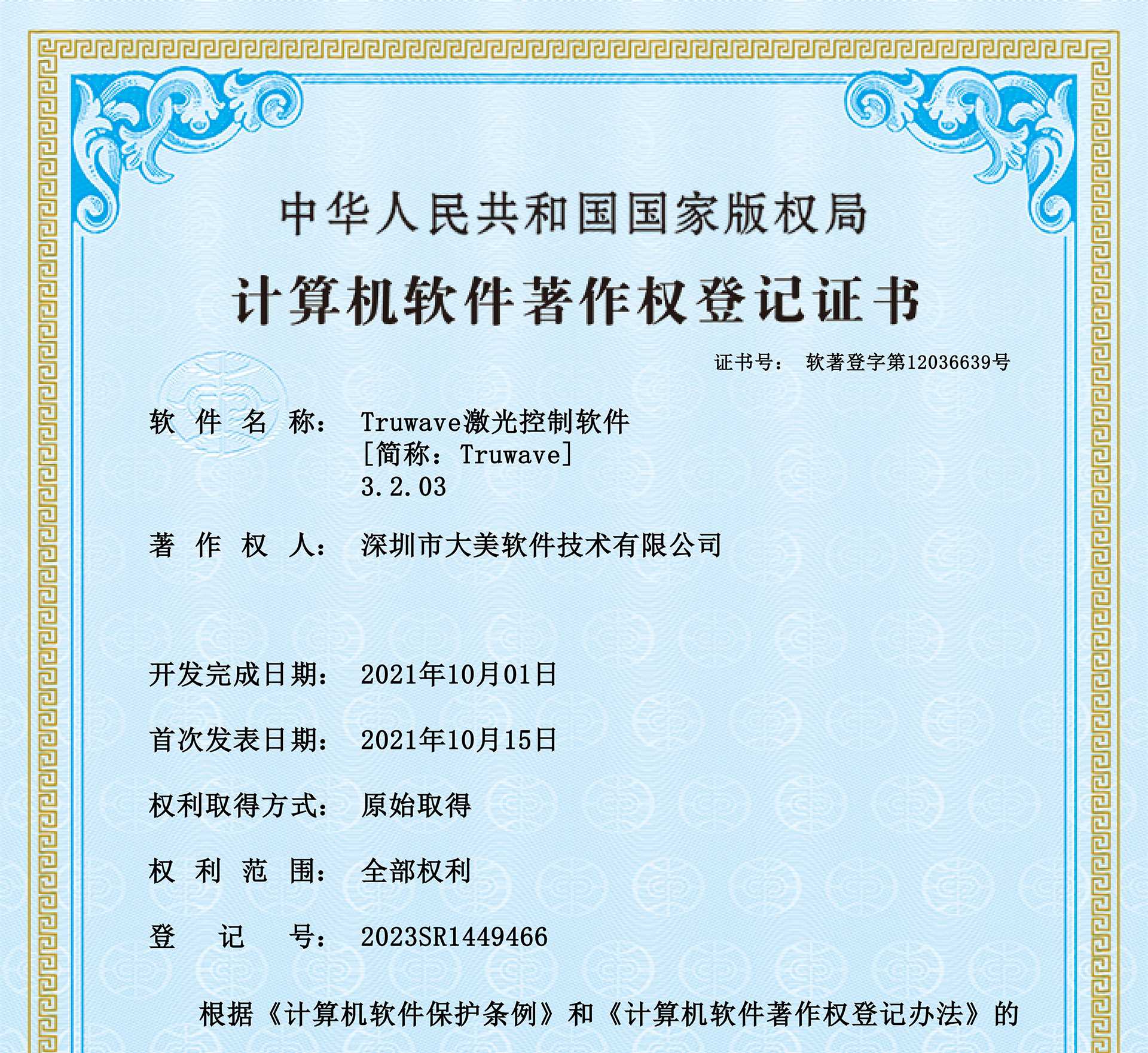 Truwave激光软件获得国家版权局计算机软件著作权登记证书